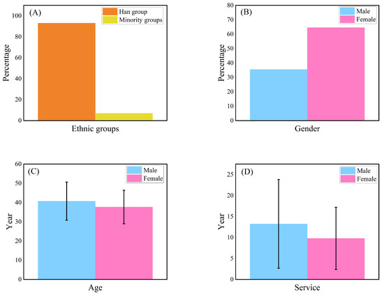 The sociodemographic attributes of teachers (A–D). The vertical bars along the y-axis represent the measures of the standard deviation.