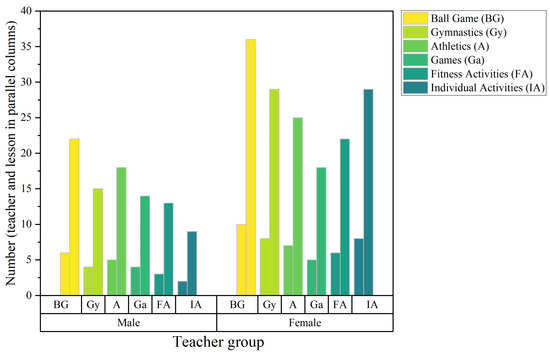 From early September 2022 to late January 2023, data were collected throughout the autumn semester. Nine SSs were observed over two 12-week cycles in order to ensure that every class was observed once during each cycle. This approach was adopted to accommodate variations in both seasons and curricula. In cases where classes were canceled due to unfavorable weather conditions or other school events such as sport meetings or midterm exams, the subsequent scheduled lesson was chosen for observation. During the semester, 252 intact lessons (126 classes observed twice) were scheduled for observation. Despite this, two lessons were observed only once due to school-wide virus outbreaks that resulted in the cancellation of the second lesson. The final data set consisted of 250 PE classes. Based on these, the details of lessons on athletics, ball games, fitness activities, games, gymnastics, and individual activities are presented in Figure 3. It was communicated to PETs in advance that their PA classes would be observed for a certain period of time. They were unaware of which lessons would be discussed until the first day of class. Teachers were specifically instructed not to modify the instructional strategies or content of their classes.