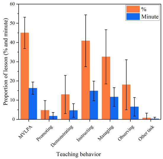 Bar graph of students’ moderate and vigorous levels of physical activity (MVLPA) and teaching behavior. The vertical bars along the y-axis represent the measure of standard deviation.
