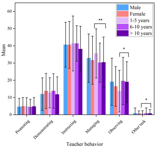Based on gender and the experience levels of the teachers, Figure 5 compares the proportions of teaching behaviors. As a result of MANOVA analyses (η2 = 0.033, p = 0.314, F (2, 252) = 1.385), the proportional distribution of all types of teaching behavior was not significantly different between female and male teachers. Despite this, the MANOVA results (η2 = 0.091, p = 0.005, F (2, 252) = 3.472) indicate that there were significant differences between teaching experiences. An analysis of the outcome of the follow-up ANOVA revealed that the significant differences in teaching experiences could be attributed specifically to differences in observing (η2 = 0.047, p = 0.009, F (2, 252) = 4.359) and managing (η2 = 0.048, p = 0.005, F (2, 252) = 4.798) behaviors. In contrast to PETs with 6–10 years and >10 years of experience, post-hoc LSD examinations demonstrated that PETs with 1–5 years of experience allocated more time to classroom management and less time to student observation and other responsibilities.