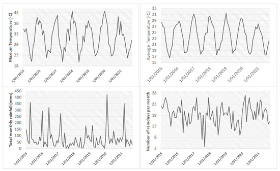 Weather-related variables over the time series (2015–2021). (Top left): Maximum temperature in °C. (Top right): Average temperature in °C. (Bottom left): Total monthly rainfall in mms. (Bottom right): Number of rainy days in a month.