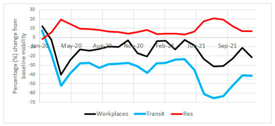 Mobility data during the study period for workplaces, transit, and residential locations. Y-axis in this figure is the percentage change from the baseline, which was established in the months before February 2020. Source: [51].