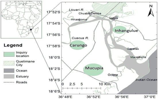 The study was conducted in three fishing communities along the BSE, in Zambézia Province, central region of Mozambique: Carungo, Inhangulue, and Mucupia. These communities were selected because they engage in fishing activities, with a particular focus on mud crab harvesting. The main channel of the BSE spans approximately 30 km from its sea entrance to the upper estuary, where two freshwater rivers, Cuacua and Licuar, converge. This estuary separates Quelimane and Inhassunge Districts (Figure 1). The climate is tropical, with two seasons: dry–cold season from April to August) and wet–warm season from October to March. The water temperature in estuary ranges from 17 to 31 °C and salinity from 24 to 35‰ and can drop during the wet season, once the river discharge has a great influence on the environment [32].