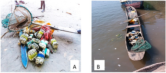 Crab fishing takes place during high tide, and a fishing line is the main fishing gear used to target crabs (Figure 2A). Several independent fishing lines are deployed in a proxy fishing area. The fishing lines are made of opportunity material and consist of a buoy that remains at the surface, which is linked to a baited hook by a line. The distance between buoys varied between 10 and 15 m. The buoy dropline, measuring 8 to 12 m, is equipped with one hook at the end of the line that comes in contact with the sea floor. The droplines’ weights, which allow the hooks to remain on the sea floor, can include rocks and opportunity materials such as lead plates decomposed from obsolete car batteries. The hooks are barbed baitholder hooks. The number of the lines and buoys to fish crabs varied among boats as the boat size and accommodation conditions of the equipment occupy most boats’ surfaces. Small shrimp from the Sergestidae family (low economic value) and small tilapias (Oreochromis mossambicus and Oreochromis niloticus) are normally used as bait in crab fishery, and the types of boats used during fishing are usually small wooden pirogues, with a maximum capacity to carry one or exceptionally two people (Figure 2B). The selling price to fishers per kg ranged from EUR 1 to 3, with an average of EUR 2 ± 0.2 SD (based on August to September 2019 surveys).