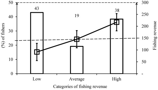 Categories of fishing revenue and the respective percentages of fishers. Dashed line represents the average revenue among fishers.