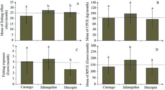 Mean monthly values of fishing effort (A), catch rates (B), fishing expenses (C), and fishing revenue (D) between communities. The dotted line represents the average mean for all communities. The (a) and (b) letters identify differences between community pairs.