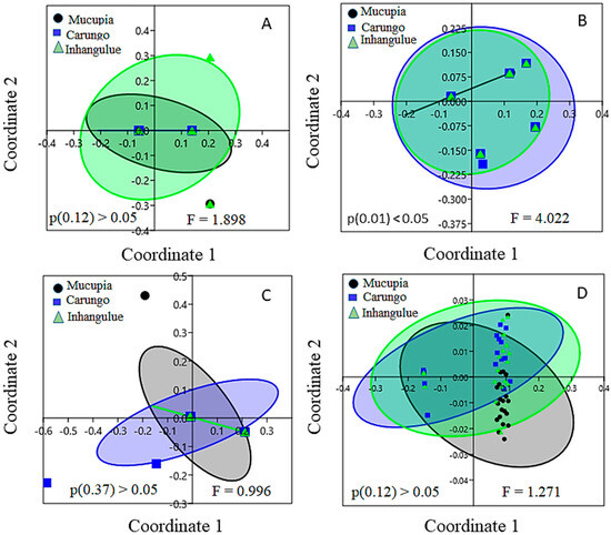 MDS analysis shows similarity patterns among fishing communities for (A) family structure category, (B) household expenditure category, (C) fishing activity category, and (D) other activities category. The ellipses represent the 95% confidence interval. P and F refer to p-value and F-statistical value of the PERMANOVA test.