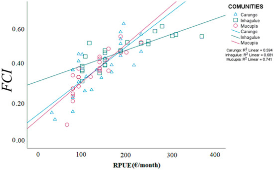 An increase in FCI values was observed with fishing revenue (Figure 8). The linear relationship established between the RPUE and FCI was positive and statistically significant (α < 0.05) for all the communities (Carungo R2 = 0.59, p < 0.05, Inhangulue R2 = 0.68, p < 0.05, and Mucupia R2 = 0.74, p < 0.05), meaning that the increase in fishing revenue has an impact on improving the socioeconomic conditions of fishers’ families.