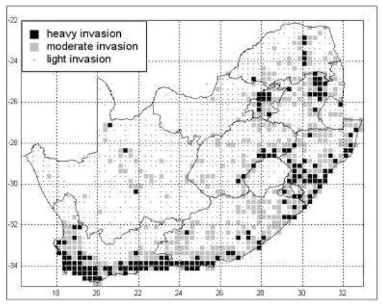 The distribution and abundance of invasive alien plants in South Africa. Source: Southern African Plant Invaders Atlas; http://www.arc.agric.za; accessed on 17 July 2021.