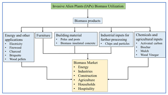 There is a need to develop an adequate policy framework and incentive program to use biomass for bioenergy and other value-added products. This study suggests that options for screening of priority products (e.g., electricity, biomass pellets, and value-added products) and biomass for industrial feedstock (e.g., species and energy values) are required. Site-specific small and medium-sized industries, such as chicken and dairy farms, could benefit from the generated thermal and electrical energy. The modern bioenergy system needs to be advanced to meet increasing future energy demand and the use of biomass from invasive alien plants for green economic development, sustainable forest management, and safeguarding biodiversity and ecosystem services in the country. It is critical to maximize the benefits of invasive alien plant biomass use in both the domestic and industrial sectors. Biomass from invasive alien plants needs to have specific and assigned depots or purchasing places nationwide, where landowners could bring their wood or biomass for sale. Being participatory, such an approach would save a large amount of expenditure on clearings, management, and developing schemes for green economic growth, green energy, industrial transformation, and environmental sustainability.