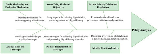 - Assessing policy goals and objectives: The goals and objectives stated in policies and regulations pertaining to digital inclusion and digital literacy education were analyzed. Special attention was given to initiatives aimed at reducing the digital divide, promoting equitable access to information and technology, and enhancing digital skills and literacy across the population.
