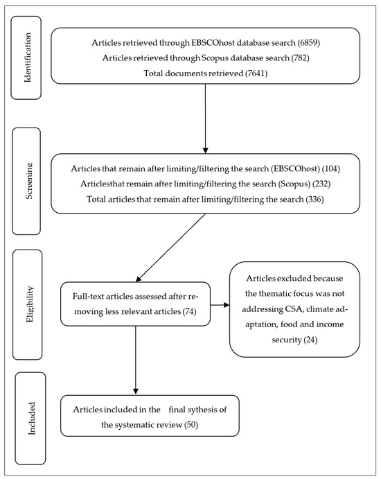 Figure 1 portrays the systematic literature review employing the Preferred Reporting Items for Systematic Reviews and Meta-Analyses (PRISMA) recommendations. The review uses two databases, EBSCOhost and Scopus, to search for relevant articles concerning the implications of CSA practices and climate adaptation strategies for food and income security in SSA countries. Although using a greater number of databases could be preferable, the EBSCOhost and Scopus databases are renowned for enhancing the breadth and depth of the search, improving the interdisciplinary scope, and allowing for advanced search, which contributes to the rigour and reliability of the search findings. Scopus is one of the largest databases for research. The EBSCOhost database provides access to a massive and varied collection of scholarly journals. The EBSCOhost and Scopus databases were chosen because of their friendly user interface and capacity to offer powerful search features. A search through EBSCOhost (the University of Zululand library institutional access) using the search terms; “climate-smart agriculture” OR “climate change adaptation” AND “food security” AND “income security” AND “urban agriculture” OR “urban farming” resulted in 6859 search results. Refining and limiting the search using the limiters “Full Text”, “Publication Date: 1 January 2003 to 31 December 2023”, “Source Types: Academic Journals”, “Language: English”, “Geography: Africa South of the Sahara, Cote d’Ivoire, Ethiopia, Ghana, Kenya, Malawi, Nigeria, Senegal, South Africa, Sub-Saharan Africa, Tanzania, Togo Uganda, Zambia” and resulted in 187 articles. After removing duplicates, 104 articles remained. A search through Scopus (the University of Zululand library institutional access) using the search terms; “climate-smart agriculture” OR “climate change adaptation” AND “food security” AND “income security” AND “urban agriculture” OR “urban farming” resulted in 782 documents found. Refining and limiting the Scopus search to full text, with a publication range of 2003 to 2023, resulted in 232 academic journal articles published in English and the Sub-Saharan Africa region. Further screening of the full texts resulted in 46 and 25 articles for EBSCOhost and Scopus, respectively.