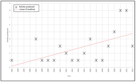 Annual scientific production of climate-smart agriculture research in Sub-Saharan Africa between 2003 and 2023. Source: Figure generated on Excel Microsoft 365 [51] based on data generated based on the Bibliometrix (Biblioshiny) package (RStudio Desktop) [52].