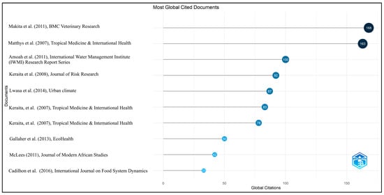 Based on the collected data, we identified the most globally cited documents/articles in the landscape of CSA research. Figure 3 displays the 10 most-cited articles from the analysed data. Various fundamental research studies emerge, as evidenced by substantial citation counts. Remarkably, the Makita et al. [53] article published in BMC Veterinary Research accounts for a significant impact, with 168 citations (Figure 3). Matthys et al. [54] in Tropical Medicine and International Health, Amoah et al. [55] (International Water Management Institute) (IWMI), Keraita et al. [56] (Journal of Risk Research), Lwasa et al. [57] (Urban climate), Keraita et al. [58] (Tropical Medicine & International Health), Keraita et al. [59] (Tropical Medicine & International Health), Gallaher et al. [60] (EcoHealth), McLees [61] (Journal of Modern African Studies), and Cadilhon et al. [62] (International Journal on Food System Dynamics) accrued 163, 100, 92 and 87, 83, 78, 50, 42, and 33 citations, respectively (Figure 3). The impact exhibited by the articles’ global citation implies the global influence that is necessary to promote a CSA and climate change adaptation agenda for achieving food and income security in SSA.
