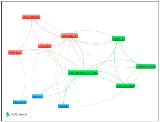 It is evident from the bibliometric analysis of the co-occurrence and keyword interlinkages that the terms “urban agriculture’’, “agriculture”, “food security”, and “land use” are central themes—occurring most frequently in the literature related to CSA in SSA (Figure 4). The bibliometric analysis of keyword occurrence shows that the countries (Ethiopia, Ghana, Kenya, and Nigeria) with the most frequent occurrence of these terms indicate the most-studied areas or geographic regions covering CSA and climate change adaptation (Figure 4). This analysis reveals the need to spread CSA and climate change adaptation research throughout SSA. The influence of urbanisation on agricultural land use is depicted by the “urbanization” and “land use” link. The dynamics of urbanisation are likely to influence urban farmers’ climate-smart choices in response to a rapidly changing climate. The keywords analysis shows a close relationship between the terms “urban farming” and “urban agriculture” and the term “food security” (Figure 4). With the food insecurity challenge becoming prominent in urban areas, exacerbated by heat islands’ intense heat from buildings and roads, UA is critical for enhancing food security in the face of climate change. Despite the numerous challenges posed by UA, the link between “urban agriculture”, “food security”, and “land use” suggests that small-scale urban farmers could leverage CSA practices to ensure food availability and, possibly, income prospects despite the fact that no link was discovered between “urban agriculture” and “income” in the analysis of the keywords from the bibliometric analysis. This disjuncture could suggest that more research is being done within the domain of food security than it is on livelihood and income. This finding could encourage more research in urban spaces and the dynamics of UA, climate change, and CSA and its nexus to income security. The keyword “humans” seems less connected than other terms (Figure 4), suggesting that the social attributes of UA, including labour, health, capacity building or urban community organizational dynamics, while acknowledged in the literature, remain understudied in terms of their implications for CSA or climate change adaptation towards resilient urban farming communities. The bibliometric keywords analysis necessitates a holistic policy framework for incorporating UA in urban planning, environmental management (land use), and socio-economic dynamics with the aim of enhancing food and income security.