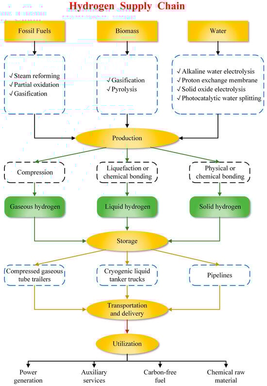 The structure of this paper is as follows: Section 2 reviews the methods of hydrogen production, which are divided into producing hydrogen from fossil fuels, biomass, and water. Section 3 discusses the hydrogen storage technologies, which can be categorized as gaseous hydrogen storage, liquid hydrogen storage, and solid hydrogen storage. Methods of transporting hydrogen by compressed gaseous tube trailers, cryogenic liquid tanker trucks, and pipelines are introduced in Section 4. The employment of hydrogen in power systems, the transportation sector, and the chemical industry is reviewed in Section 5. These sections collectively highlight the key technologies supporting the hydrogen supply chain, addressing all essential components. Section 6 analyzes the challenges and prospects of the hydrogen supply chain, and the paper’s conclusions are presented in Section 7.
