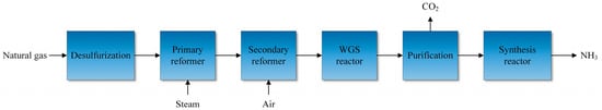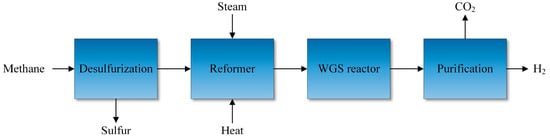 Steam reforming (SR) is the most mature method for producing hydrogen from fossil fuels. Natural gas is a common hydrogen source for the SR process [23]. The SR process that uses natural gas as the raw material is known as steam methane reforming (SMR). In the SMR process, methane reacts with steam to produce a synthesis gas that is rich in H2 [24]. Then, the synthesis gas will be sent into the water–gas shift (WGS) reactor. In the WGS reactor, the CO in the synthesis gas will further react with steam and produce more H2 [25]. The final stage of SMR is separating CO2 from the synthesis gas for purification. The process of SMR is shown in Figure 3. Catalysts are used in the SMR to accelerate the reaction between methane and steam. High temperatures are required because SMR is an endothermic process. The heat needed in this process is usually supplied by natural gas [26].
