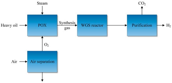 Partial oxidation (POX) in hydrogen production involves the reaction of hydrocarbons like methane or heavy oil with steam and oxygen. This reaction results in the partial oxidation of hydrocarbons and the generation of synthesis gas enriched with hydrogen [42]. Notably, heavy oil has a higher carbon-to-hydrogen ratio compared to methane, leading to 69% of the hydrogen production stemming from steam in the POX process. This process also produces more carbon monoxide than the SMR process [43]. Consequently, the synthesis gas from POX requires additional hydrogen enhancement via the WGS reaction. The process of POX is shown in Figure 4. POX necessitates pure oxygen for the oxidation of hydrocarbons due to the challenge of nitrogen separation. Depending on whether a catalyst is used, POX can be classified as thermal partial oxidation (TPOX) or catalytic partial oxidation (CPOX).