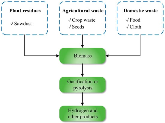 Biomass is recognized as a kind of renewable energy source. Common biomass includes agricultural waste, domestic waste, and plant residues [52]. With the global development of renewable energy, there is increasing attention on using biomass for hydrogen production. Although using biomass for hydrogen production can lead to carbon emissions, the formation of biomass can absorb CO2. Consequently, biomass is considered a more friendly energy source for the environment than fossil fuels. Presently, prevalent techniques for hydrogen production from biomass involve biomass gasification and biomass pyrolysis [21]. Figure 6 is a diagrammatic sketch of hydrogen production from biomass.