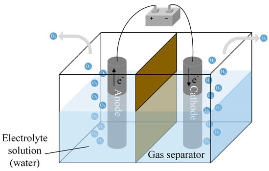 Alkaline water electrolysis (AWE) is the most widely used electrolysis technology for hydrogen production, with significant use since the 20th century. The fundamental principle of AWE for hydrogen production is the electrochemical decomposition of water into O2 and H2, powered by an electric current. In AWE, hydrogen gas is generated at the cathode of the alkaline electrolysis cell (AEC) [65]. Water’s limited intrinsic electrolytic capability necessitates the addition of alkaline electrolytes like KOH or NaOH, which enhance its electrical conductivity and thereby increase the efficiency of hydrogen production [66]. Traditionally, asbestos materials have been used as separators between the anode and cathode in AWE. The electrolytic reactions in AWE are represented by the following equations [35]: