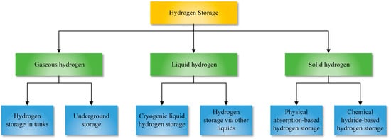 Hydrogen storage is recognized as a promising solution for medium- to long-term energy storage. It has a high mass energy density but a significantly lower volumetric energy density compared to conventional fuels (1/3000th that of gasoline). Therefore, a critical requirement in developing hydrogen storage is enhancing the volumetric energy density of hydrogen [97]. As is shown in Figure 8, current hydrogen storage methods are divided into three main types: gaseous, liquid, and solid-state storage. Each of these storage methods offers unique advantages and challenges, and their suitability varies depending on the specific context.