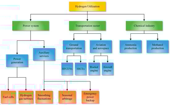 Hydrogen, known for its high energy density and low carbon footprint, is emerging as a sustainable and promising energy carrier for the future [7,8]. The concept of using hydrogen as an energy carrier dates back two centuries. Despite its low atmospheric concentration, hydrogen, the third most abundant element on Earth, is found in various compounds like petroleum, natural gas, water, and biomass [9]. Water is the most abundant source of hydrogen, making water electrolysis an ideal method for its production. Historically, the high cost of water electrolysis limited its widespread adoption. However, rapid advancements in renewable energy have enabled the possibility of economically viable electrolytic hydrogen production [10]. Hydrogen production from renewable sources yields zero carbon emissions, and hydrogen, as a fuel, produces no emissions other than water, thus eliminating environmental pollution. Therefore, integrating hydrogen with renewable energy generation enables a zero-carbon-emission energy process. Hydrogen also offers the advantage of high energy density; as is shown in Table 1, hydrogen surpasses most conventional fossil fuels in terms of its higher heating value (HHV) and lower heating value (LHV). Hydrogen finds extensive applications due to these attributes. Hydrogen can be used as a kind of clean fuel for power generation. It can be integrated into power systems for better reliability. Hydrogen can also be used as a fuel for hydrogen fuel cell vehicles [11]. In the chemical industry, hydrogen has been a kind of raw material for producing chemical products such as ammonia and methanol [12]. Due to the versatile applications of hydrogen, it is considered a promising energy carrier for the future [13].