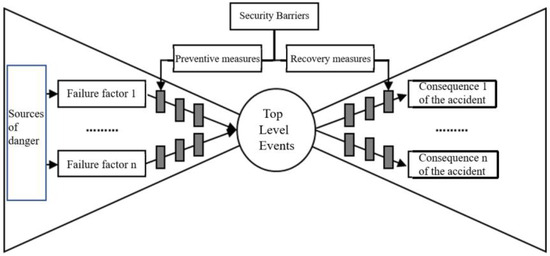 The Bow-tie method uses a combination of accident tree (FTA) and event tree (ETA) [21]. It consists of five main components, which are accident hazard sources, preventive measures, top-level events, recovery measures, and accident consequences. Figure 2 shows the structure of the model. In the model, preventive measures refer to the measures set up in advance to prevent the occurrence of downhole safety valve failure events. The top-level event is the downhole safety valve failure, and the recovery measures refer to the emergency rescue measures taken after the failure occurs, as well as the approaches taken in order to return to normal. The consequences of the incident are the multifaceted effects of the failure. The combination of preventive and restorative measures forms a safety barrier to reduce the overall risk and consequences of the risk, and both realise the reduction in the probability of failure and the impact of consequences from the source of failure to the end. The model can clearly obtain the specific factors that lead to the failure of downhole safety valves and the corresponding consequences, and organically combine the accident prevention and recovery measures to ensure the safety of downhole safety valve operations. Therefore, this study applies the model to the failure risk factor analysis of downhole safety valves.