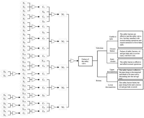 In previous studies, most of the failure consequences of underground safety valves have been classified into four categories, which are failure to open, closure failure, premature closure, and seal leakage. However, seal leakage is essentially a consequence of closure failure. In addition, since downhole safety valves are mostly installed in shallow locations downhole, the weight of the pipe string hanging below the valve body is high. This places high demands on the reliability of the threads at the joints. Not only do they need to meet structural reliability but they also need to be corrosion resistant, as well as have high sealing performance. Therefore, this paper classifies the consequences of downhole safety valve failure into four types: inability to open, closure failure, early closure, and disconnection. The Bow-tie model of different types of downhole safety valves with common causes of failure is established, as shown in Figure 3.