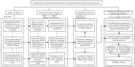 The purpose of the above research process on the built environment and microclimate is to reveal the potential relationship [19,43] between the spatial form of traditional neighborhoods and the microclimatic environment in an operable way; to determine the parametric indexes of the form and the environment, respectively; and then, to explore the mapping laws and conversion models to achieve the parametric translation of the microclimatic performance objectives and design elements to provide parametric ideas for the optimal layout and design of the thermal environment of traditional neighborhoods. The overall framework of the technical program is shown in Figure 1.
