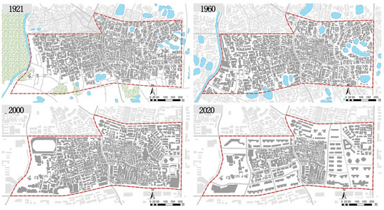 In order to analyze the spatial morphological characteristics of the area with the change in time, this study collected historical data from several sources, including the “Nanhai County Foshan City Street Map” of 1928, as well as the features [49] of Google satellite image maps in 1985, 2000, and 2020, which were calibrated and vectorized by ArcGIS, and obtained architectural texture maps of the four periods, as shown in Figure 2.