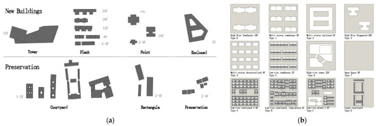 In terms of the evolution of architectural assemblage, the basic pattern of the area is dominated by the construction of the Qing Dynasty, and the typical residential cluster plots are mostly of the multi-row parallel type, with the architectural forms dominated by bamboo, with interspersed courtyards, and the core area is dominated by the Chinese-style monolithic residential units and Chinese-style collegiate residential units [51]. In this study, the architectural units were divided into two categories according to their forms: new buildings and preserved buildings. In terms of new buildings, there were four main types: tower, slab, point, and enclosure, among which slab and point were the main forms of residential buildings, and their plan area varied significantly with height. The existing buildings mainly included the courtyard type, the long strip type, and the point type buildings. The combination of different building units formed several types of building groups. Based on the actual building units in each year of the urban renewal process from 1928 to 2020, this study concluded that there were three main types of new building groups, namely, townhouse type, staggered type, and dispersed type, and three main types of retained building groups, namely, free type, mixed type, and free-standing type, as shown in Figure 3.