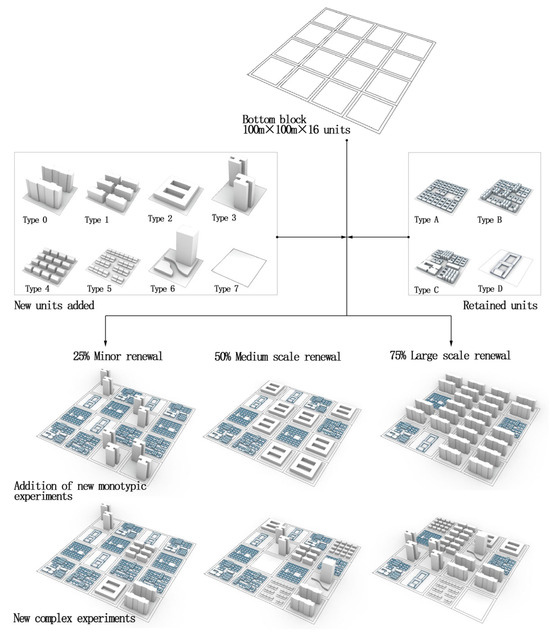 This experiment was conducted in an area of 400 m × 400 m to generate a variety of blocks with different morphological layouts by randomly combining 12 basic morphological units. The experiment was divided into two groups, i.e., a new single type and a new composite type, and each group was conducted according to the high, medium, and low (75%, 50%, and 25%) updating ratios, i.e., (4, 12), (8, 8), and (12, 4), respectively. In this way, each group of experiments contained three small experiments with different addition ratios, which allowed for a comprehensive discussion of the impact of different addition types and ratios on the quality of the thermal environment in the neighborhood. The logic of the experimental design is shown in Figure 4.