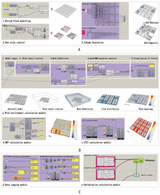 Design platform for microclimate performance-based design of traditional neighborhoods.((A)—Neighbourhood schema generation, (B)—Environment simulation module, (C)—Optimisation and recording).