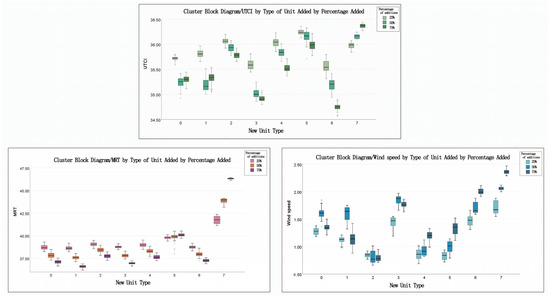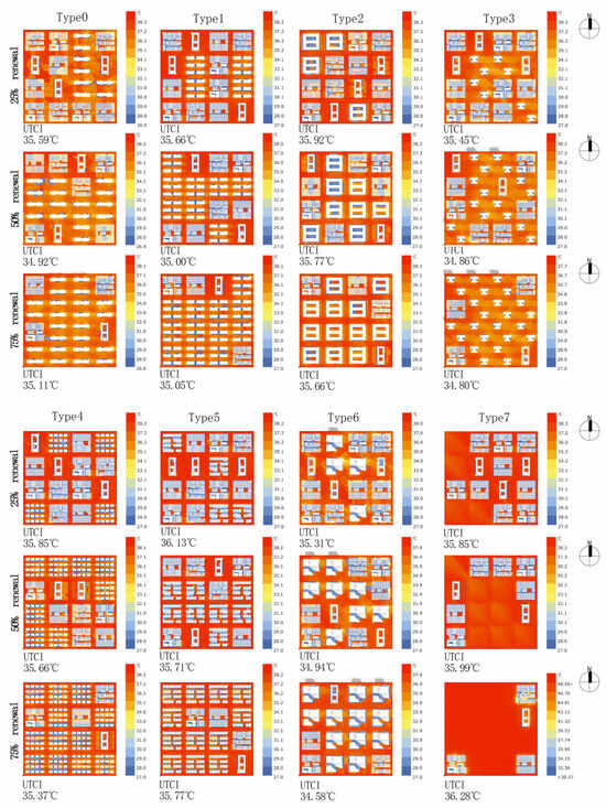 The trends in the UTCI values were more intricate as they related to wind speed and radiant temperature. The impact of the building height of additional units on thermal comfort was more pronounced in neighborhoods with a 25% augmentation ratio. In addition, the taller the building, the lower the UTCI value for outdoor thermal comfort in general. There were notable variances in thermal comfort between different types of new units at varying addition proportions. At the 50% addition proportion, type 0 and type 1 exhibited better thermal comfort, in contrast with the 75% addition proportion, where type 3 and type 6 had inferior thermal comfort. The thermal comfort was substandard in neighborhoods with the 25% renewal proportion in comparison with those with higher renewal proportions. The allocation of morphological components and microclimates within the neighborhoods is exhibited in Figure 8.