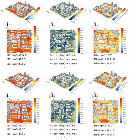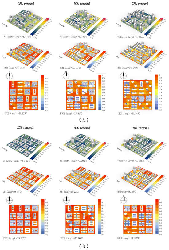Taken collectively, among the blocks with varying proportions of new units, those with open space or low-density, high-rise units exhibited higher average wind speeds. Meanwhile, the blocks with enclosed layouts or low-rise, high-density units displayed inferior ventilation performance. The mean radiant temperature of a block was significantly influenced by the height of the new unit buildings. Usually, blocks with greater heights of new unit buildings provided better radiative shading, resulting in lower mean radiant temperatures. In contrast, blocks with lower heights of new unit buildings have higher mean radiant temperatures.