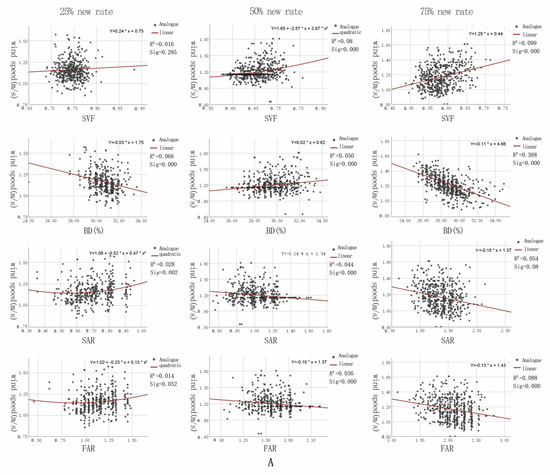 The DW values of the model were around 2—at 1.947, 2.021, and 2.010—for which the residuals of the model were independent in the first-order positive autocorrelation test. The F-values of the regression models under the three new additions ratios in the ANOVA were significant at a level of 0.000, indicating the high statistical significance of the predictive models.