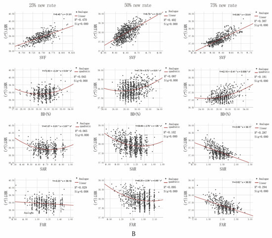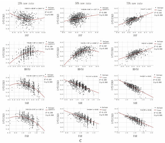 Overall, significant correlations were found between all four neighborhood morphology indicators and the UTCI at all three renewal percentages, with relatively consistent trends. The correlation between the neighborhood morphology indicators and the UTCI was highest at the 75% update ratio and lowest at the 25% update ratio. Among these four indicators, FAR and SAR exhibited the greatest correlations with UTCI, whereas BD and SVF had relatively low correlations with UTCI.