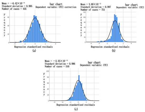 We derived a multiple linear regression model using the linear modeling module in SPSS Statistics, with the four spatial morphology indicators at three different addition ratios as independent variables and UTCI as the dependent variable. Table 3 illustrates the summary statistics of the regression equations of the morphometric indicators with UTCI under varying addition proportions. The regression equations yielded R values of 0.782, 0.816, and 0.804 for the three update proportions, indicating the significant explanatory power of the model. Further adjustments to the R2 values demonstrated the model’s ability to predict the dependent variable UTCI, with respective explanatory powers of 60.7%, 66.4%, and 64.4%.