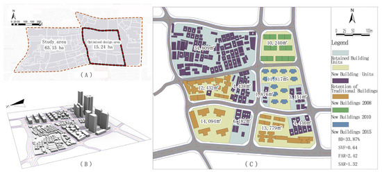 The optimization design area we selected was on the eastern side of the Donghuali area in the Zumiao Old Town district of Foshan City, covering an area of 15.24 hectares. The buildings in this area have been gradually replaced by modern buildings, especially the eastern and southern side units have been more significantly renewed. The new buildings were mainly constructed after the overall renovation plan of the Ancestral Temple Donghua Lane Area in 2008, while the ratio of the area of the new units to that of the preserved units shows that the new units accounted for 46.82% of the total area, as shown in Figure 11.