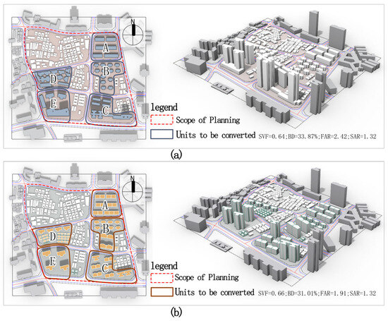 Comparison of before and after preliminary optimization scenarios location map. ((a)—Status quo programme: A Multi-storey townhouse, B Multi-storey free standing, C High-rise townhouse, D Multi-storey enclosed type, E Staggered high-rise; (b)—Preliminary optimized scheme: A Small high-rise townhouse type, B Multi-storey free standing, multi-storey townhouse type, C Small high-rise townhouse, high-rise staggered type, D Low-rise townhouse, multi-storey free-form, E High-rise staggered).