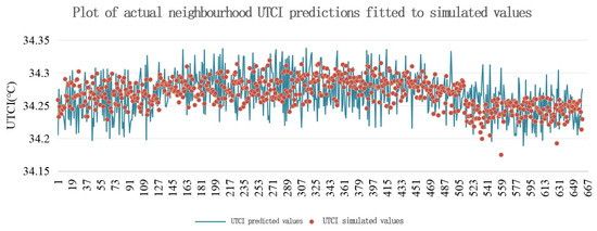 To further assess the precision of the multiple linear regression model in forecasting UTCI values in neighborhood renewal, the morphology parameters of the 660 optimal search samples could be individually substituted into the prediction equation. This provided insight into the relationship between the simulated UTCI values in actual neighborhoods and the predicted values of the UTCI regression equations. Figure 15 illustrates the similarities between the simulated UTCI values of actual neighborhoods in the 50% updating proportion scenario and the predicted values of the equation. The R2 value of 0.605 and the sig value of 0 further support this observation. The multivariate linear regression equation of ideal neighborhoods was shown to be effective in the process of updating actual neighborhoods, as evidenced by its high significance and correlation. Additionally, the prediction equation has practical value, as planning designers can use it in the pre-programmed stage of renewal planning and design to assess thermal comfort quickly and easily (as measured by UTCI).