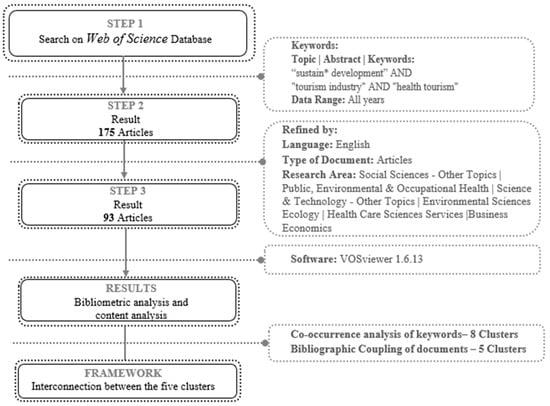 This study uses an SLR on sustainable development in health tourism as a methodology. Embraced across various disciplines and areas of inquiry, the research methodology of SLR has experienced notable expansion and growth in recent years [60]. The SLRs adhere to rigorous pre-defined methods, facilitating the progression of knowledge, minimising the scope for bias, and ensuring the possibility of replication [60,61]. In the development of this research, the selection and compilation of representative articles from the Web of Science database occurred without temporal delimitation. This research utilises WoS (Web of Science) as it plays a crucial role in academic research by providing access to high-quality scientific information. As one of the largest and most respected bibliographic databases, WoS offers a vast collection of peer-reviewed articles across diverse disciplines, allowing researchers to gain valuable insights and track the progress of knowledge in their areas of interest. Thus, the WoS database is appreciated and recognised as a high-quality archival source for collecting materials used by several previous researchers as a robust and high-quality data source. Its scope and precision make it a reliable source for bibliometric analyses and scientific research trend studies. Likewise, integrating resources such as VOSviewer allows for a more detailed and comprehensive analysis of available data, further improving understanding of the current scientific landscape [62]. The characteristic of a user-friendly platform like WoS allowed the set research questions to be answerable in this paper. First, the research was conducted on a topic-based search of the WoS Core Collection without imposing any time restrictions, employing the specified keywords: “sustain* development” AND “tourism industry” AND “health tourism”, and it was carried out on 2 August 2023. These keywords were considered and chosen considering the objective of this study, which is the analysis of sustainable development in health tourism. The truncation (‘*’) was used to cover all fitting terms, allowing us to restrict the scope to articles that specifically address the defined words and their derivations. The search yielded 175 articles. Second, the screening process covers the research refinement procedure. The filters applied were “type of document”, “language”, and “research areas”. In this sense, the analysis was developed only with journal articles, whereas conference papers, books, and book chapters have been excluded. On the other hand, only articles written in English and from the areas of Social Sciences—Other Topics, Public, Environmental and Occupational Health, Science and Technology—Other Topics, Environmental Sciences Ecology, Health Care Sciences Services, and |Business Economics areas were chosen. After the application of the filters mentioned, the research was reduced to 93 articles. Figure 1 shows the research protocol.