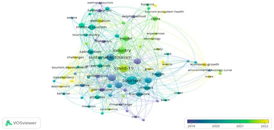 In Figure 5, it is possible to show the most significant keywords that emerged between 2018 and 2022, demonstrating the originality and actuality of the theme. The keywords that appeared in 2018 were “sustainability”; in 2019, the words “sustainability development” and “tourism” stood out. In 2020, the word most mentioned was “impact”; in 2021, it was “medical tourism health”. Words that have surfaced more recently in 2022 indicate a recent surge in interest in the field, with the most frequently mentioned term being “tourism ecosystem health”.