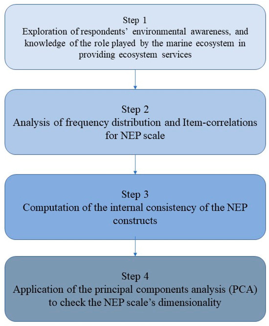 The analysis consisted of four steps: (1) a summary of the descriptive statistics of the respondents to explore the environmental awareness and their knowledge of the role of the marine ecosystem in providing crucial natural resources, ecosystem services, and human health security; (2) a summary of the responses to the 15 items of the NEP scale using a five-point Likert scale response system; (3) the computation of the internal consistency of the NEP constructs using Cronbach’s coefficient alpha; and (4) the performance of the PCA to check the NEP scale’s dimensionality. Figure 1 illustrates the main phases of the research method adopted in this study.