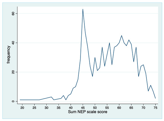 Other information that is helpful for evaluating people’s ecological worldview is the individual total NEP score (Figure 2), calculated as the sum of all the 15 scores on the individual scale items. In this study, the total NEP score ranged from 19 to 75 with an average value of 56.09 (standard deviation of 9.06), which indicates a good respondents’ ecological attitude [52]. Higher scores show a stronger feeling for the ecological worldview.