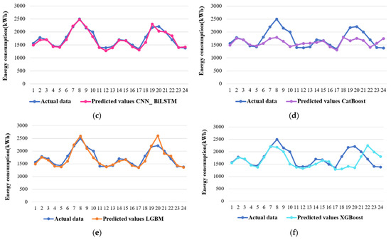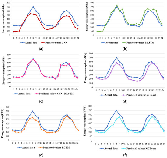 Comparison of predicted and actual residential sector energy consumption of all the models: (a) CNN, (b) BiLSTM, (c) CNN_BiLSTM, (d) CatBoost, (e) LGBM, and (f) XGBoost.