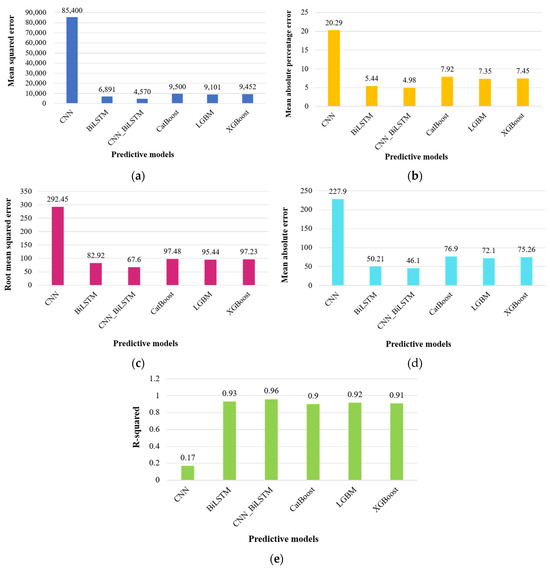 Graphical representation of evaluation metrics for forecasting residential sector energy consumption: (a) mean squared error, (b) mean absolute percentage error, (c) root mean squared error, (d) mean absolute error, and (e) R-squared.
