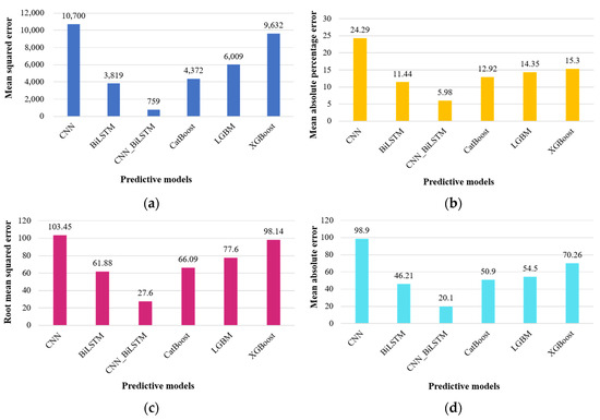 When comparing with benchmark deep learning models, the CNN_BiLSTM model stands out, displaying a significantly lower MAPE, which is reduced by approximately five times compared to these models. The reduction in MAPE ranges from 5.98% to 24.29%. In contrast, the machine learning models’ predictive capabilities fall short in comparison to the CNN_BiLSTM model. In summary, the CNN_BiLSTM consistently delivers superior forecasting performance.