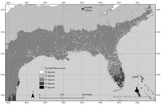 The current geographical range of E. rosea is primarily the Southeastern United States (Figure 1). In areas where the average minimum temperature of the coldest month is less than 25 degrees, instances of E. rosea observations are sparser. Our satellite colony discovered in 2006 is both the farthest reproducing population from the coast and the only recorded reproducing population north of the 36th parallel. It is also approximately 125 miles from the next nearest E. rosea observation (Figure 1).