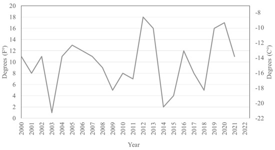 Lowest recorded temperature in Davidson County, Tennessee, for the years 2000 to 2022 [27].